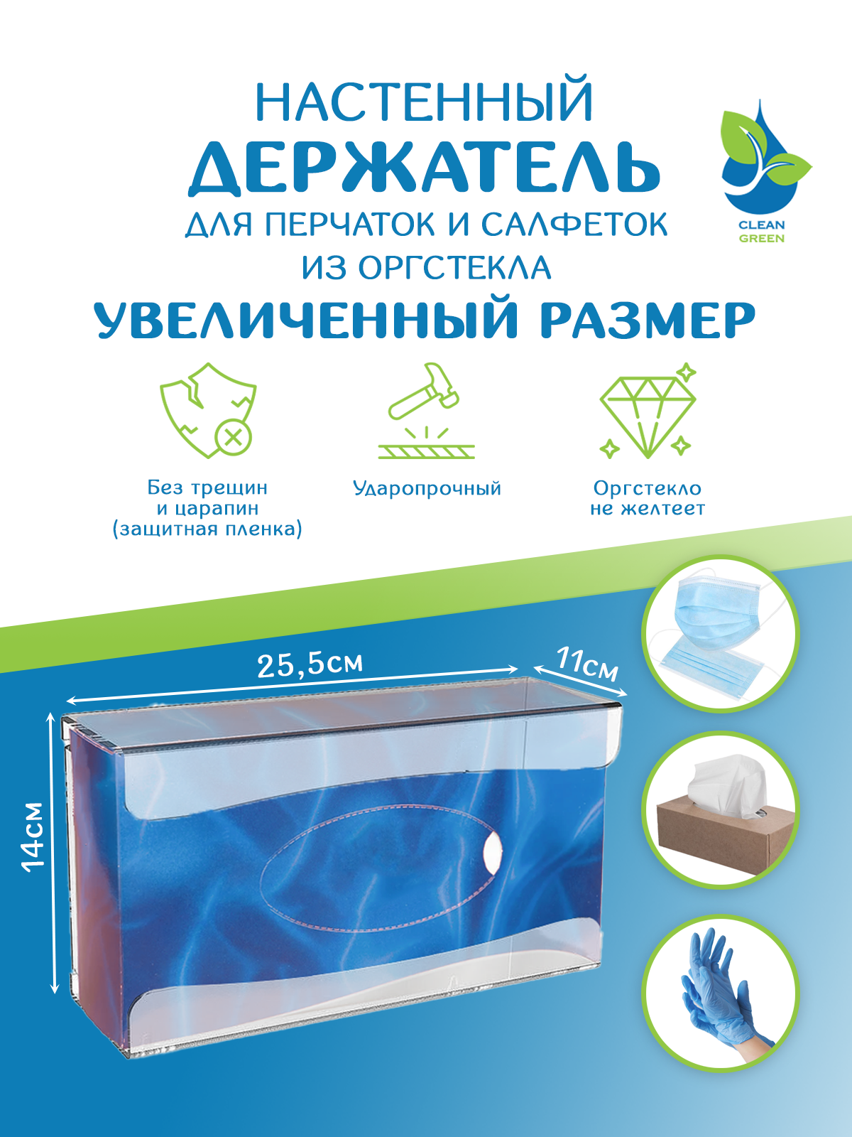 Выполнен из высокачественного оргстекла. Доставка в коробке, упакован в пупырчатую пленку.На диспенсер нанесена пленка от царапин, вложен крепеж в комплект.